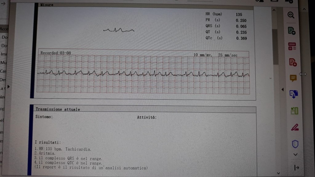 In questo caso, una fibrillazione atriale parossistica, la cui diagnosi immediata ha permesso a questo associato di recarsi subito al Pronto Soccorso per la risoluzione del problema aritmico. Brevi periodi (durata di pochi minuti) di battito cardiaco irregolare possono essere identificati e correttamente interpretati dallo specialista, senza bisogno di ricorrere a fastidiose registrazioni di 24 o più ore dell’ECG (Holter), spesso inconcludenti perché effettuate in momenti nei quali non compare la fibrillazione atriale. Poterlo utilizzare è semplice, basta contattare l’Associazione attraverso il sito, compilare il questionario sul rischio aritmico ed essere iscritti a Proteggo il mio Cuore ETS.